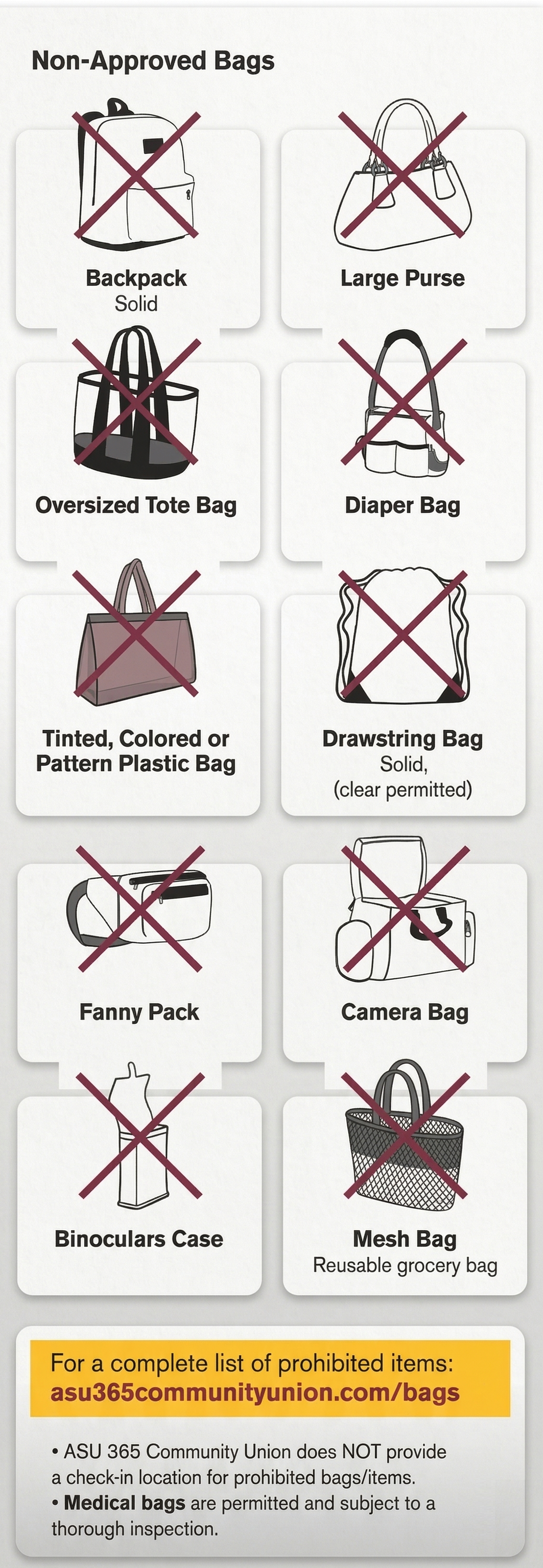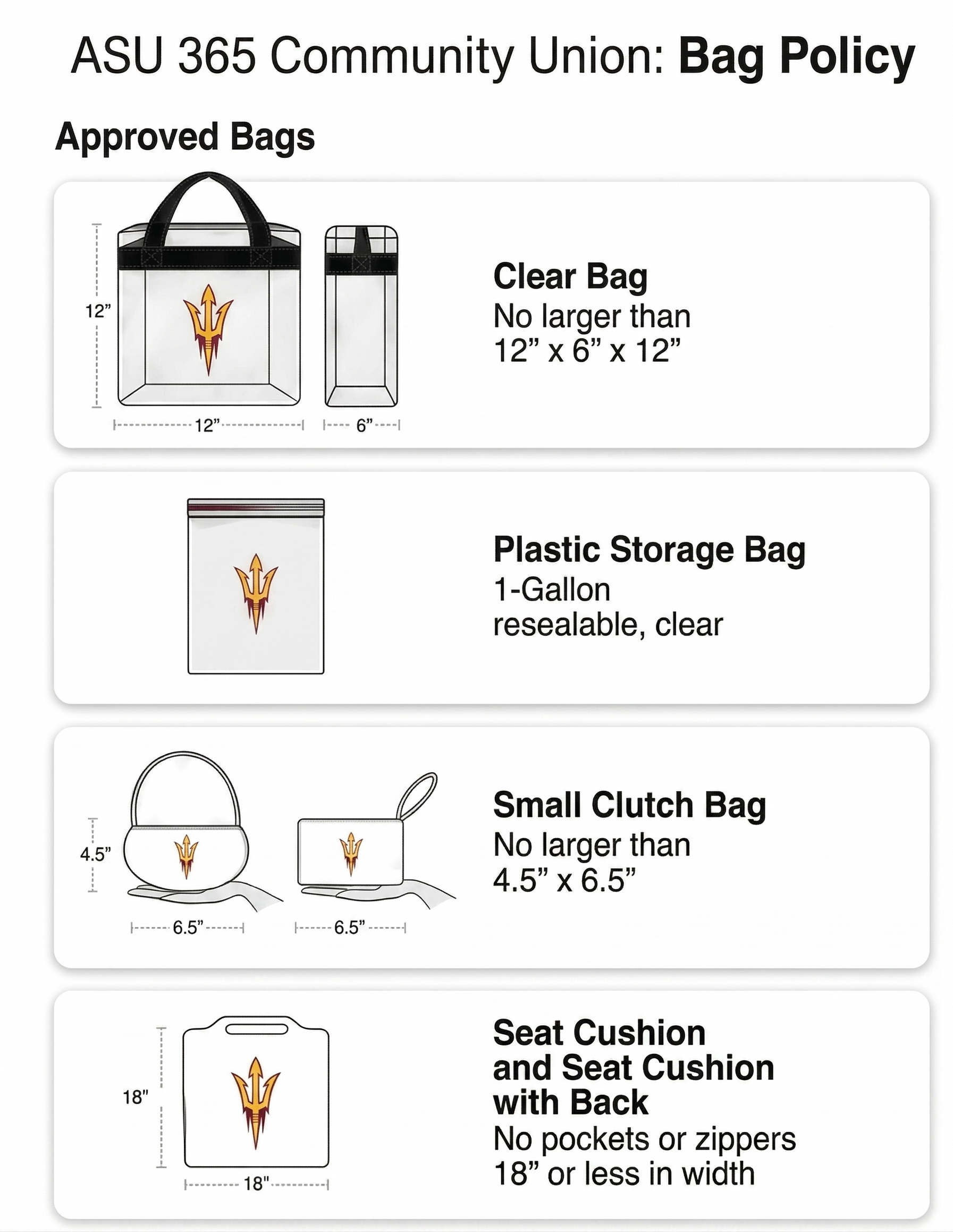 To enhance public safety and make stadium access more efficient, ASU adopted a Clear Bag Policy. Patrons may bring in one (1) clear bag no larger than 12" x 6" x 12" or a 1-gallon plastic storage bag. Patrons are limited to one clear bag per person, along with a small clutch or purse for privacy. Please refer to the pictures above for non-approved bags.